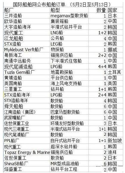 根據(jù)國際船舶網(wǎng)公布的5月2日至5月13日的船舶訂單來看,鉆井船和液化船高端領(lǐng)域的表現(xiàn)異常搶眼;中日韓仍然是世界上訂單最為活躍的三個(gè)國家。其中,韓國在高端造船上顯示出“誰與爭鋒”的氣勢(shì),中國在高端領(lǐng)域亦有所收獲,但仍然以傳統(tǒng)造船為主,日本已經(jīng)走環(huán)保路線。