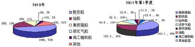 從新船訂單結(jié)構變化來看,今年1季度集裝箱船市場迎來井噴行情,共成交55艘、244.1萬修正總噸,占全球訂單總量38.8%,超過散貨船位列首位;散貨船行情活躍程度明顯減弱,僅成交79艘、153.3萬修正總噸,占總量24.4%,較集裝箱船低14.4個百分點;鉆井船訂單高達15艘、64.6萬修正總噸,排第三位;另外,液化氣船、豪華游船和海工裝備分別以62.4萬修正總噸、25.6萬修正總噸和19.8萬修正總噸排第四至第六位;而年初相對看好的油船市場表現(xiàn)低迷,合計僅成交12艘、11萬修正總噸,僅為總量的4%。與2010年全年新船訂單結(jié)構相比,以修正總噸計,散貨船所占比例為53%,油船占比為18%;而集裝箱船和液化氣船為11%和3%,鉆井船全年成交量僅為5艘,由此可見,新造船市場訂單需求結(jié)構已發(fā)生明顯變化。