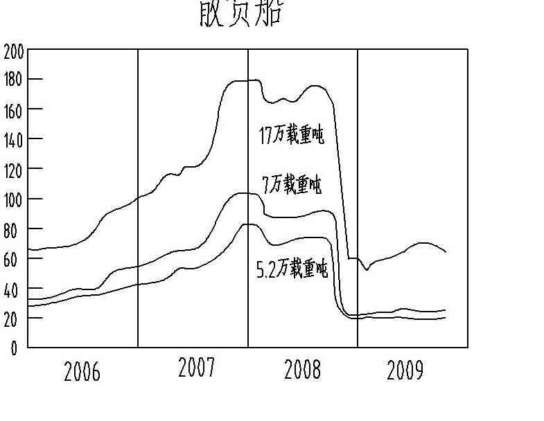 以下是2006年1月-2009年10月世界部分船型(散貨船)新船現(xiàn)售價格走勢圖