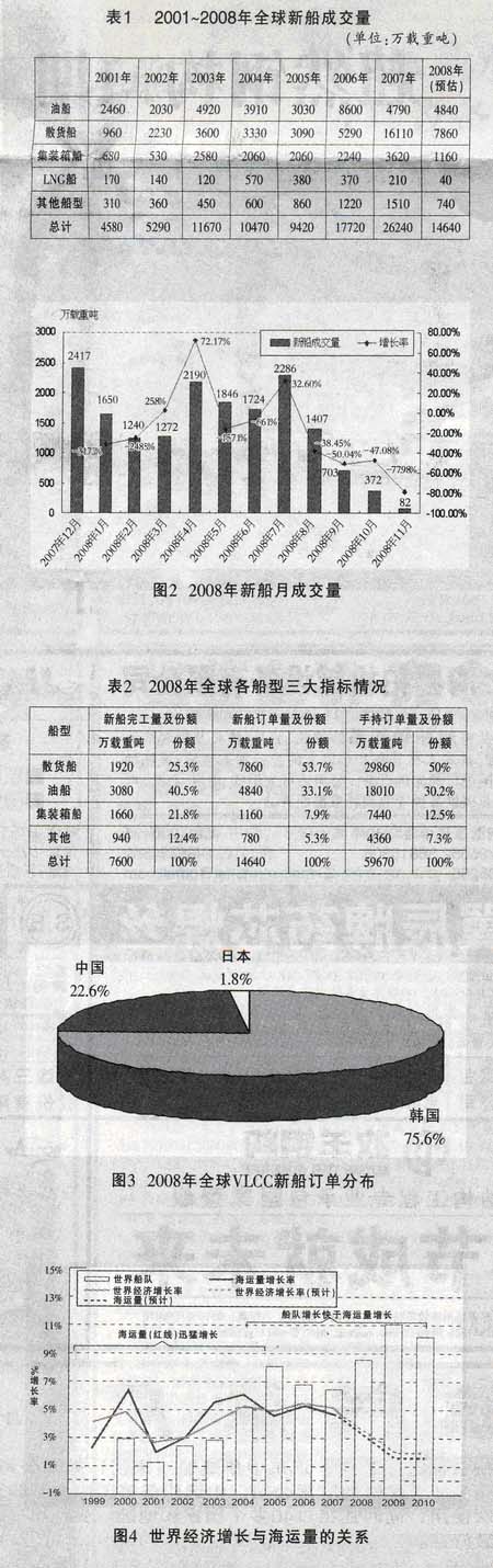 2008年,全球新船成交約2028艘、1.45億載重噸,以載重噸計,比2007年下降了44.6%,也明顯低于2006年的水平,但仍高于2000~2005年的年均成交量,在多重不利因素的相繼沖擊下,新船訂造市場交出這樣的成績單也算差強(qiáng)人意。但從單月的成交量看,整個市場逐月下滑的趨勢非常明顯。