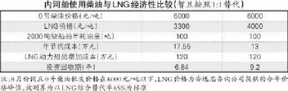 不同于歐洲內(nèi)河LNG動(dòng)力船的發(fā)展,中國(guó)最早在內(nèi)河船使用LNG作為動(dòng)力的嘗試來(lái)自商業(yè)嗅覺(jué)相對(duì)靈敏的民營(yíng)能源企業(yè)。這些企業(yè)拿出資金對(duì)船東的內(nèi)河船進(jìn)行LNG動(dòng)力改造,又恰逢國(guó)家深入推進(jìn)節(jié)能減排,得到一定的政府補(bǔ)貼。當(dāng)柴油與LNG的價(jià)格差達(dá)到2500元/噸時(shí),使用LNG可為船東節(jié)約30%的燃料成本,按照當(dāng)時(shí)30萬(wàn)~40萬(wàn)元的改造成本,即便沒(méi)有政府補(bǔ)貼,3~4年也可通過(guò)燃料價(jià)格差收回改造成本,之后便可通過(guò)銷(xiāo)售LNG獲得利潤(rùn)。但伴隨國(guó)家對(duì)LNG動(dòng)力船標(biāo)準(zhǔn)規(guī)范的提高,改造費(fèi)用增加到100萬(wàn)元以上,同時(shí)柴油與LNG價(jià)格差越來(lái)越小,當(dāng)投資回收期超過(guò)8年,船東基本不會(huì)再考慮使用LNG做燃料(見(jiàn)表)。
