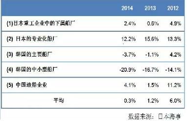 計算結(jié)果顯示2014年的平均營業(yè)收入利潤率為0.3%,比2013年下降了0.9個百分點。這主要是由于韓國船廠在海工項目上的失利導(dǎo)致了盈利能力急劇惡化,從而拉低了平均水平。與此相對照,專業(yè)化的日本船廠盡管也略有下滑,但卻仍然保持了高于10%的利潤率水平,最高的是日本的新來島船廠,利潤率高達18%。在全球造船業(yè)盈利總體水平幾乎接近于零的情況下顯得格外突出。