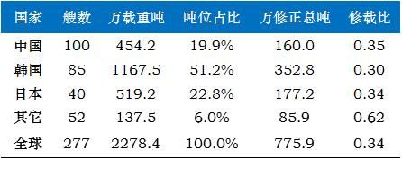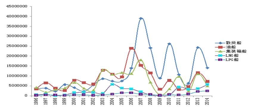 2)日本在專注散貨船市場基礎上,積極拓展集裝箱船市場,韓國在鞏固液化氣船市場地位同時,加大油船、集裝箱船搶單力度。