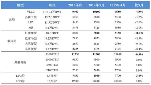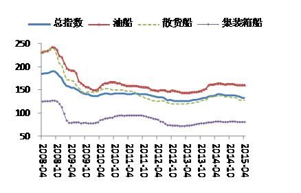 2)2015年4月新船價格綜合指數(shù)為133點,較2014年中140點的高點下滑7點,典型船型新船價格再次下滑趨勢十分明顯。