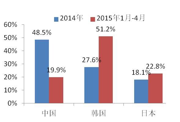 1)2015年1月-4月,中國、韓國和日本分別承接訂單454.2萬載重噸、1167.5萬載重噸和519.2萬載重噸,分別占全球份額19.9%、51.2%和22.8%,日韓市場份額較2014年明顯擴大,中國市場份額明顯縮小。