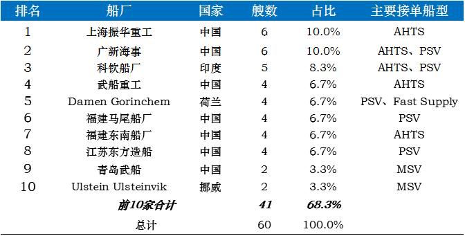 2)以艘數(shù)計,上海振華重工、廣新海事均獲得6艘海工船,印度科欽船廠獲得5艘海工船,分列前三位。
