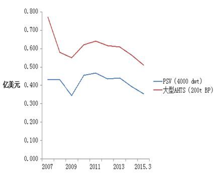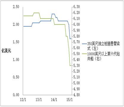 2)年初以來,350英尺自升式鉆井平臺價格累計降幅達20%左右,海洋工程船價格平均降幅約10%,其中技術(shù)含量較低的中小型海洋工程船表現(xiàn)較為明顯。
