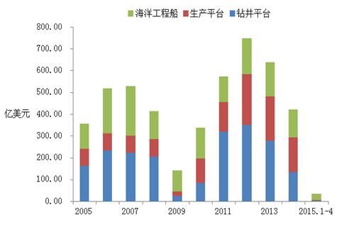 1)在預期油價維持低位、油公司大幅削減投資的背景下,2015年海工裝備市場成交額將大幅回落,按1-4月成交趨勢外推全年約為110億美元,即使考慮后期市場有所改善,預計全年也難以突破200億美元。