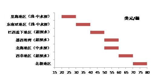 2)盡管絕大部分地區(qū)海洋油氣開采的盈虧平衡點(考慮了固定成本和邊際成本的收支平衡點)在80美元/桶以下,但由于海洋油氣開發(fā)的風險較大,其資本收益率要求較高(可達30%及以上),隨著長期油氣開發(fā)仍將向深水進軍,油價不可能長期停留在當前的水平。