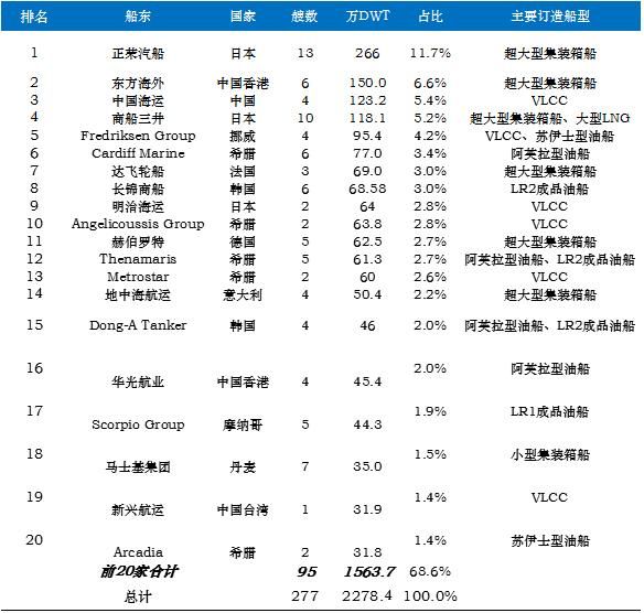 2)2015年1月-4月,全球訂造量前20名船東累計訂造1563.7萬載重噸,總量68.6%,較2014年22.3%水平迅速提升。10500TEU、18000TEU及20150TEU超大型集裝箱船、30.8萬噸VLCC等熱點船型的集中成交,是市場集中度迅速提升的主要原因。