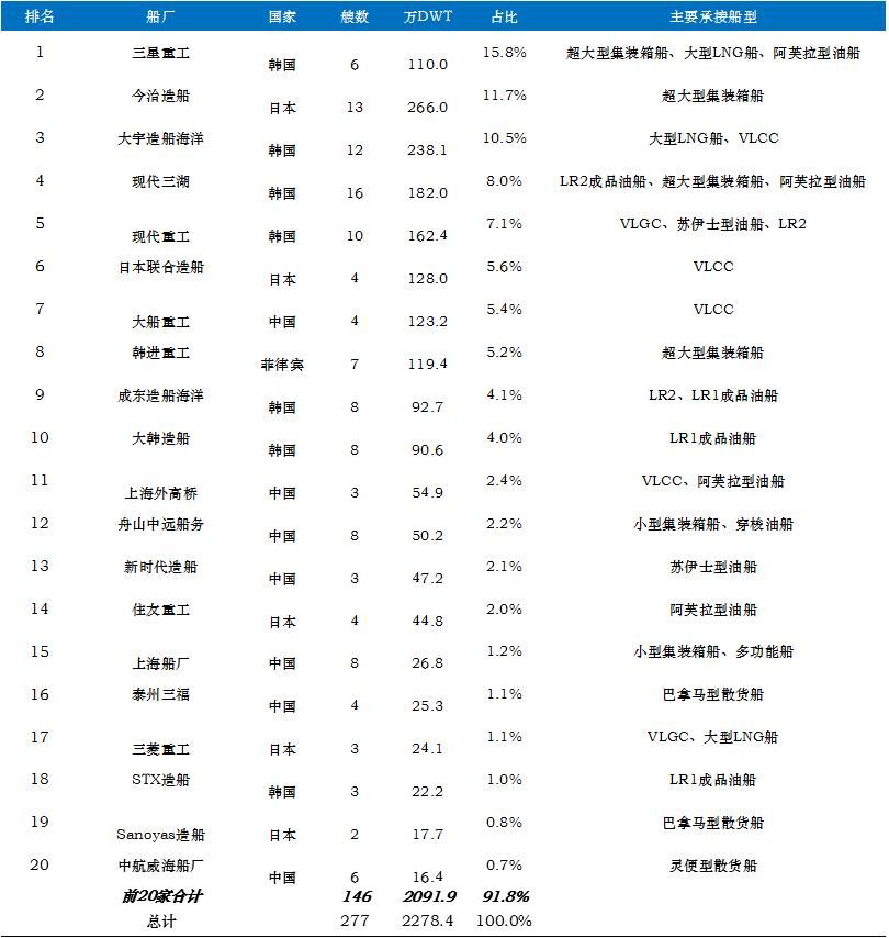 1)2015年1月-4月全球前20名船廠接單占比91.8%,遠高于2014年60%的水平,集中度大幅提升。