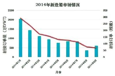 分季度來看,2013年四季度成交3548萬載重噸,2014年前三季度分別成交2213萬、1322萬、864萬載重噸,成一路下滑走勢。8月份更是慘淡,新接訂單量僅為115萬載重噸,9月份從載重噸來看,新接訂單量出現(xiàn)了大幅反彈,但成交艘數(shù)僅為35艘,比8月份的37艘還低。新接訂單載重噸數(shù)的反彈與9月份中遠(yuǎn)集團(tuán)在國內(nèi)船廠訂造多艘大型集裝箱船、大型散貨船有關(guān)。