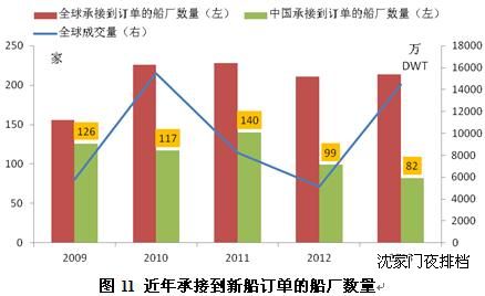但中小型造船企業(yè)接單仍存在較大困難。盡管2013年全球新船成交量出現近2倍的增長,但全球承接到新船訂單的船廠數量卻與2012年基本持平。而中國船廠訂單承接總量增長了200%以上,但承接到訂單的船廠數量卻從2012年的99家減少到2013年的82家。這說明,盡管船舶市場出現大幅反彈,但受益者主要是大型造船企業(yè),中小船廠由于競爭力較弱,訂單承接依然困難。