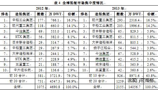 2013年,全球造船市場接單集中度保持高位,前10家造船集團承接量占比為63.8%,前20家合計占比為78.6%,與2012年相比有所下滑,主要原因是成交量的大幅反彈為不少前期接單困難的大中型船廠帶來訂單。