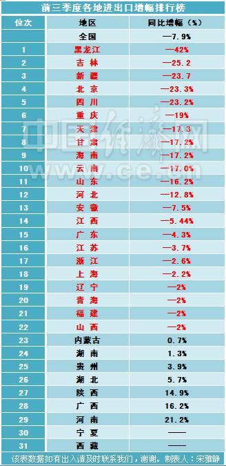中國經(jīng)濟(jì)網(wǎng)記者疏理制作了前三季度各地進(jìn)出口情況表,表中可以看出外貿(mào)形勢的復(fù)雜與嚴(yán)峻性,除了寧夏、西藏兩地未公布數(shù)據(jù),在已經(jīng)公布的29個(gè)省區(qū)中,有22省區(qū)外貿(mào)進(jìn)出口值均為負(fù)增長。其中黑龍江情況最差,以同下降42%為全國倒數(shù)第一,吉林同比下降25.2%倒數(shù)第二,新疆同比下降23.7%倒數(shù)第三。東北三省在做整體經(jīng)濟(jì)不振的情況下,進(jìn)出口貿(mào)易受到的不良影響也十分明顯。